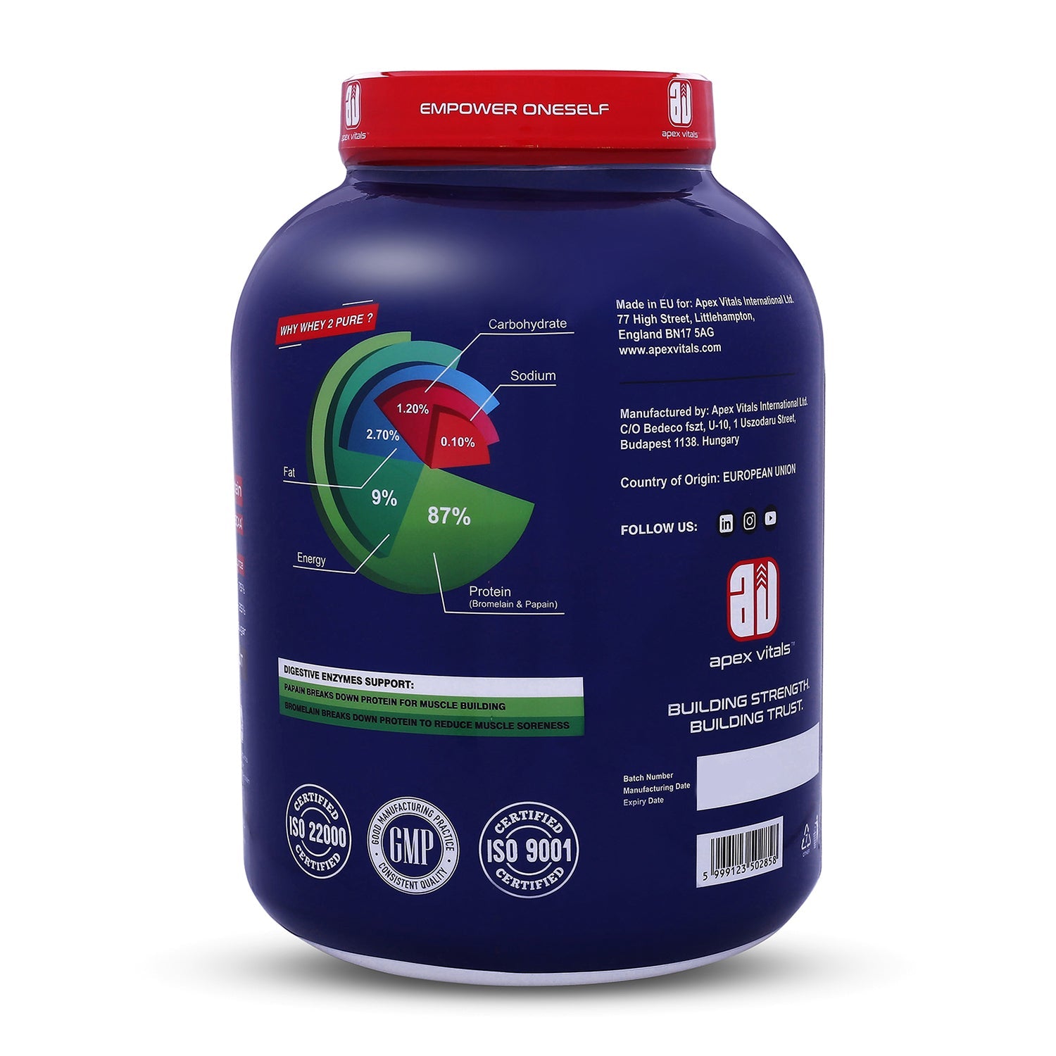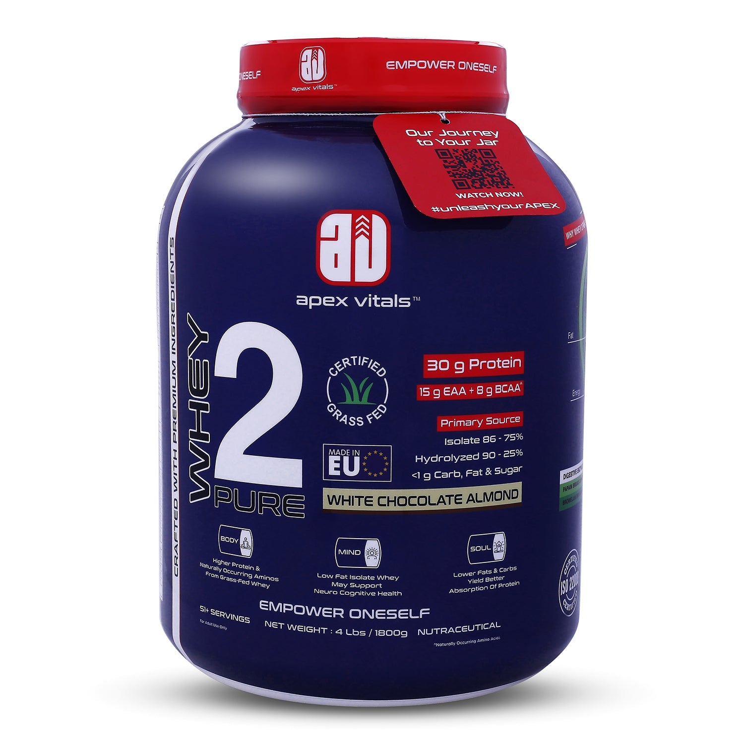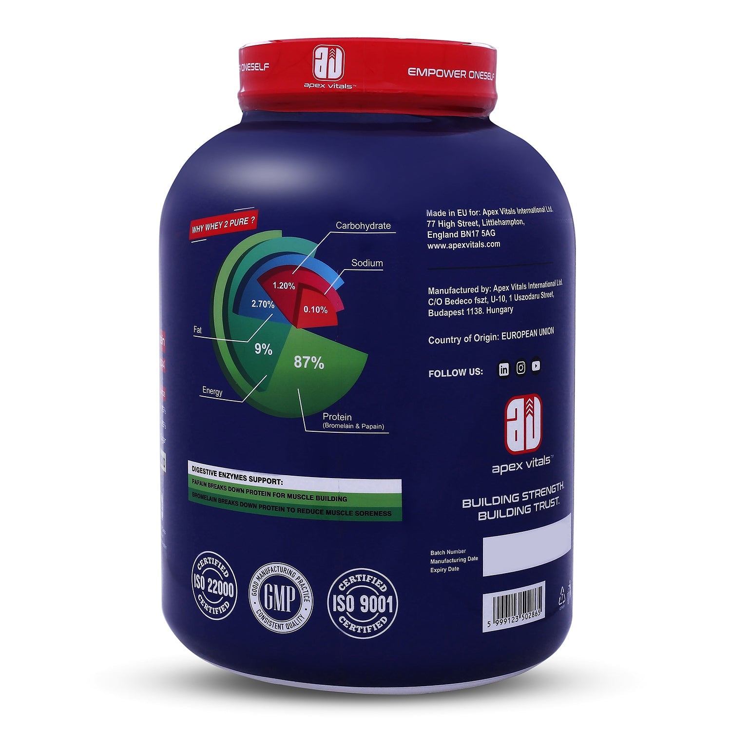 Apex Vitals Whey 2 Pure. Grass-fed Whey made in EU. Whey Isolate & Hydrolyzed. 30g protein, 15g EAA+8g BCAA. Digestive Enzymes. Muscle Build & Recovery. 1.8kg (4lbs) - 51+ Ser
