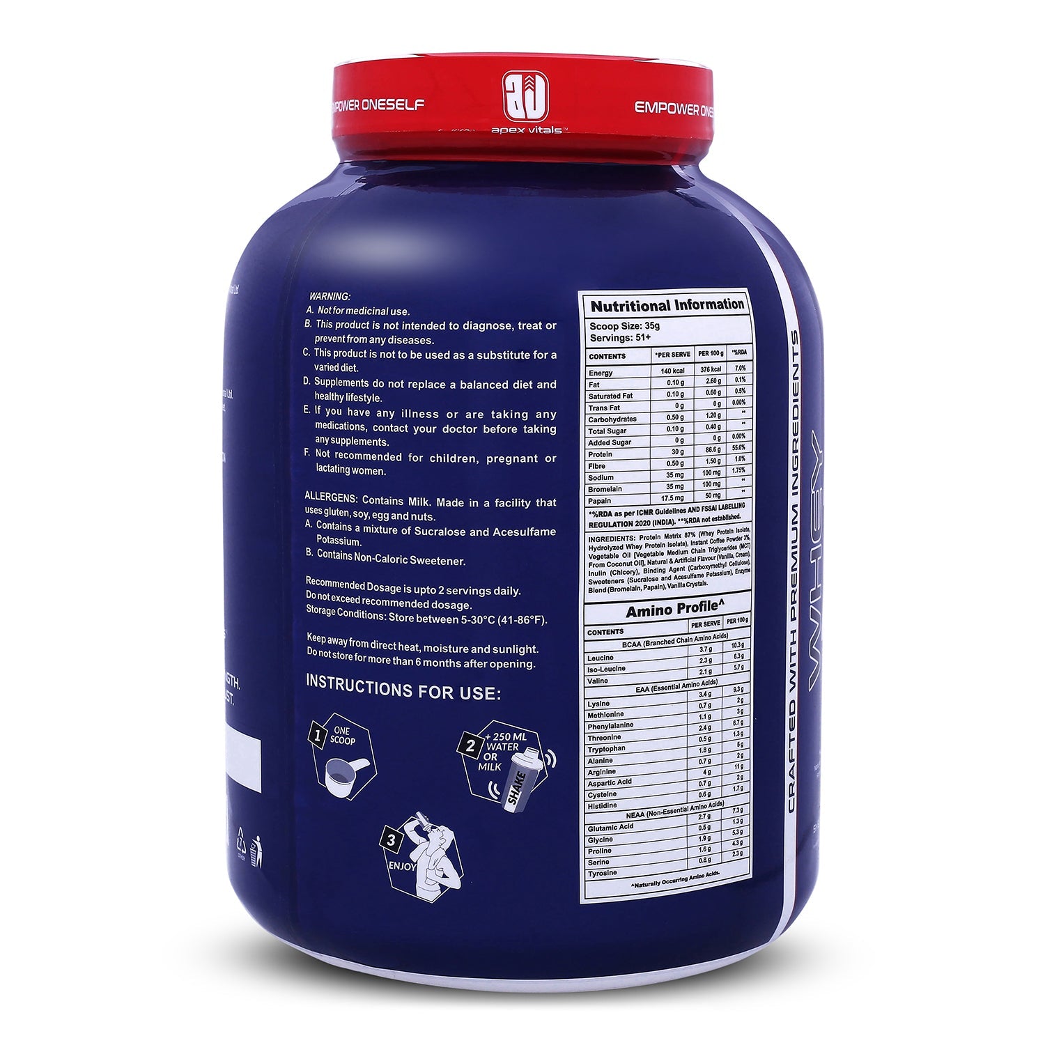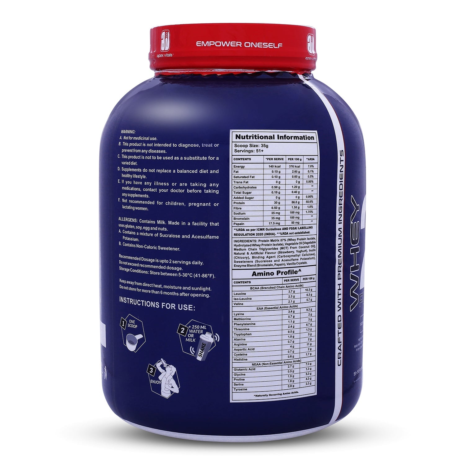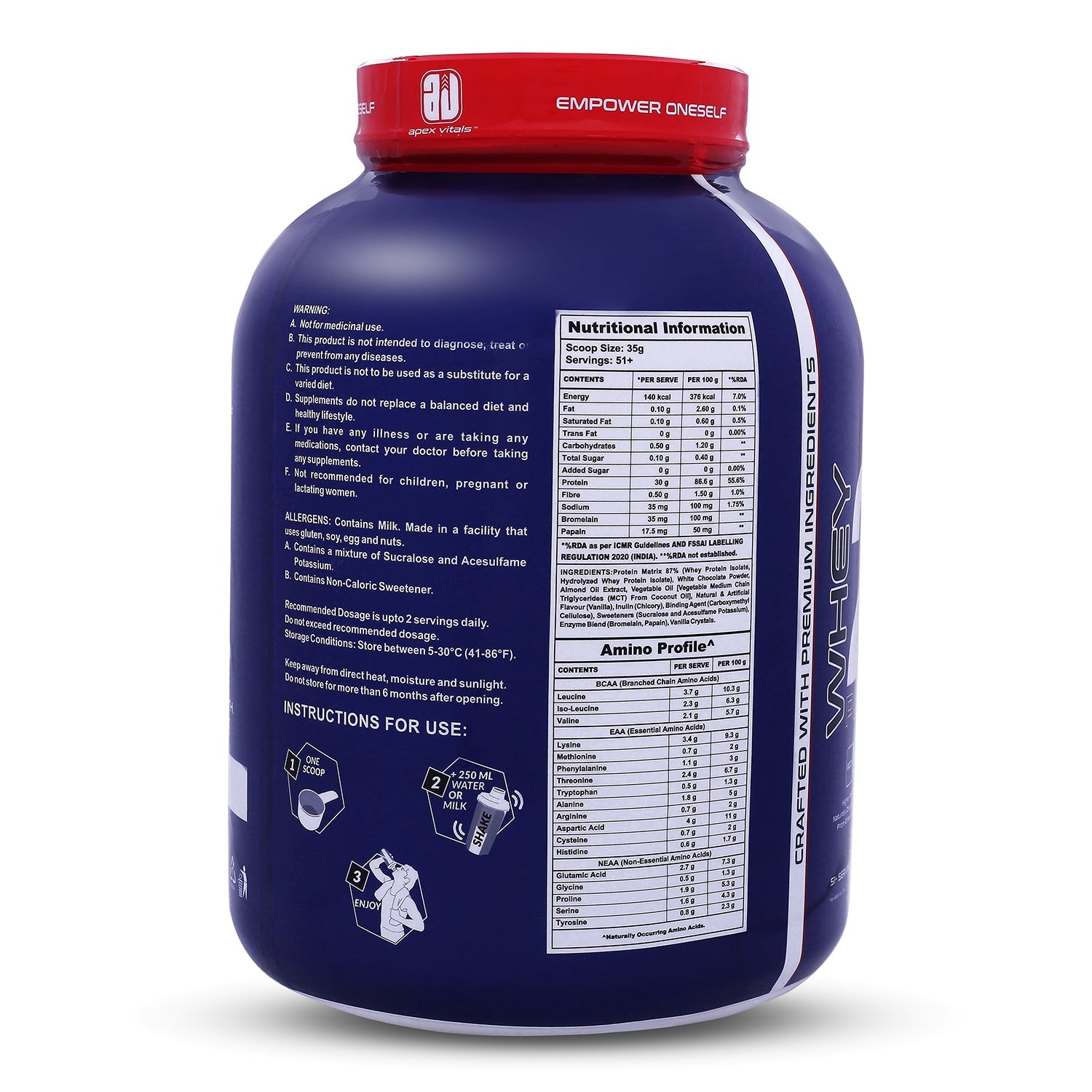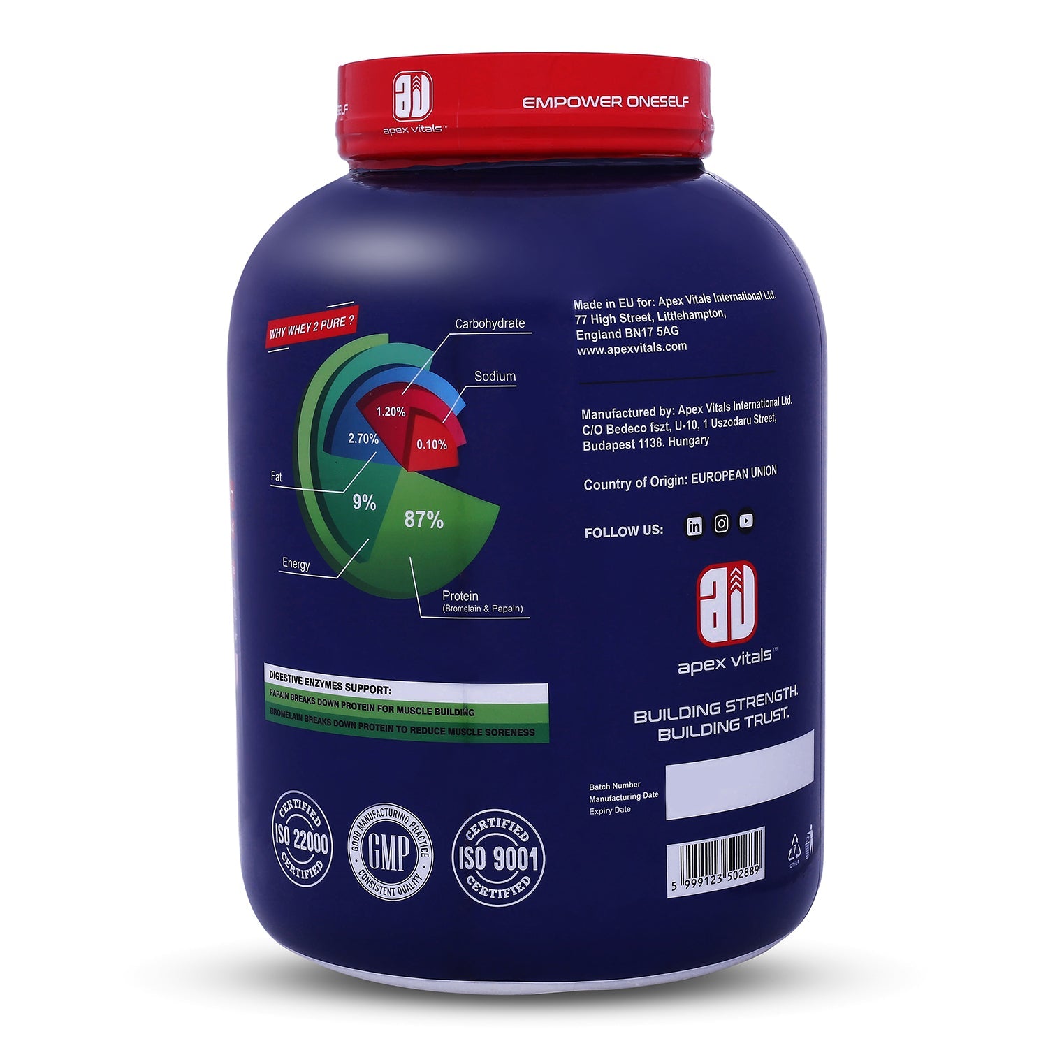 Apex Vitals Whey 2 Pure. Grass-fed Whey made in EU. Whey Isolate & Hydrolyzed. 30g protein, 15g EAA+8g BCAA. Digestive Enzymes. Muscle Build & Recovery. 1.8kg (4lbs) - 51+ Ser