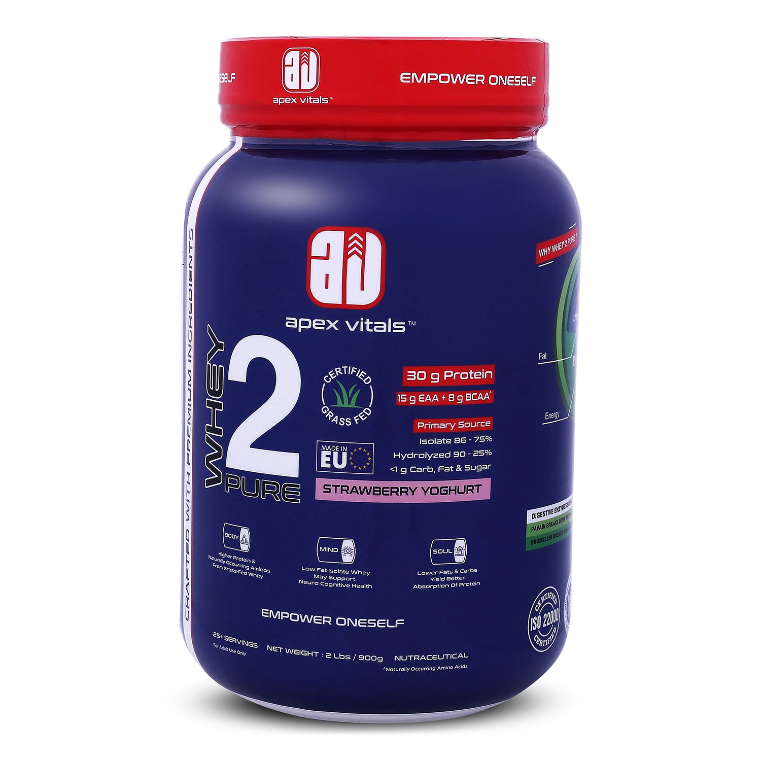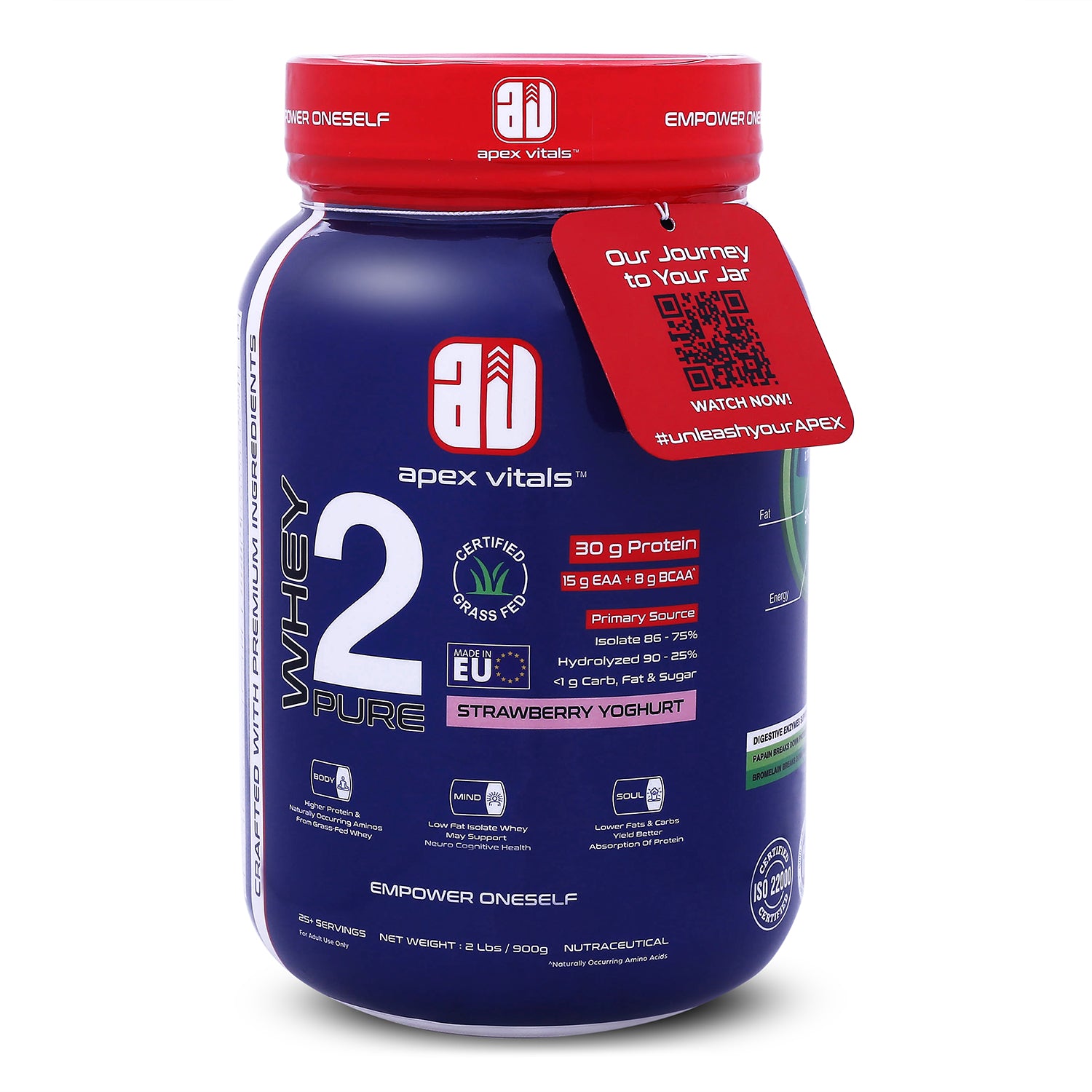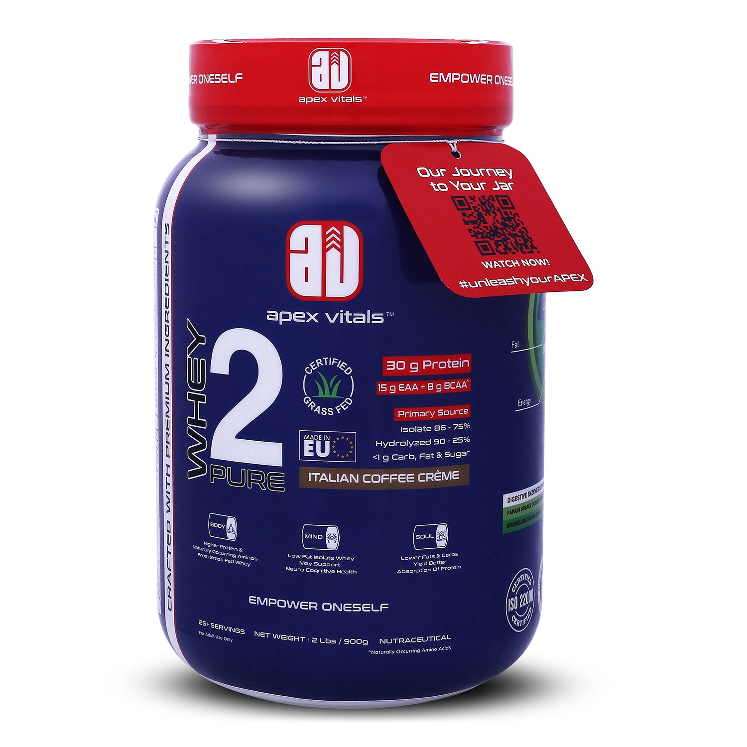 Apex Vitals Whey 2 Pure . Grass-fed Whey made in EU . Whey Isolate & Hydrolyzed . 30g protein, 15g EAA+8g BCAA . Digestive Enzymes . Muscle Build & Recovery . 900gm (2lbs) - 25+ Ser