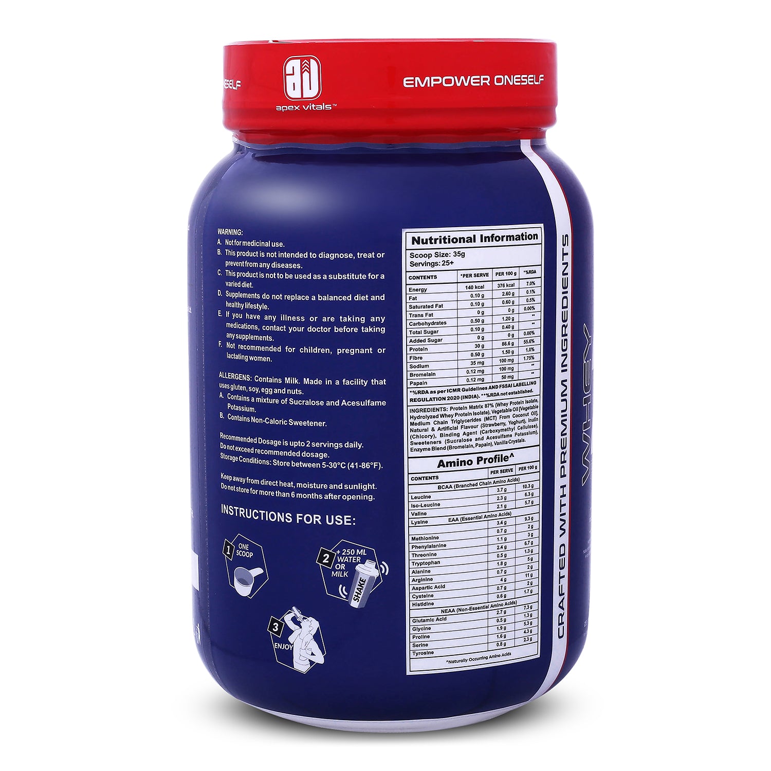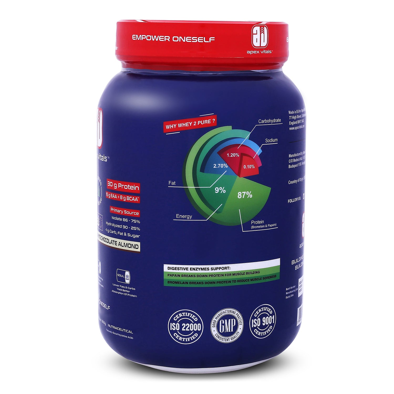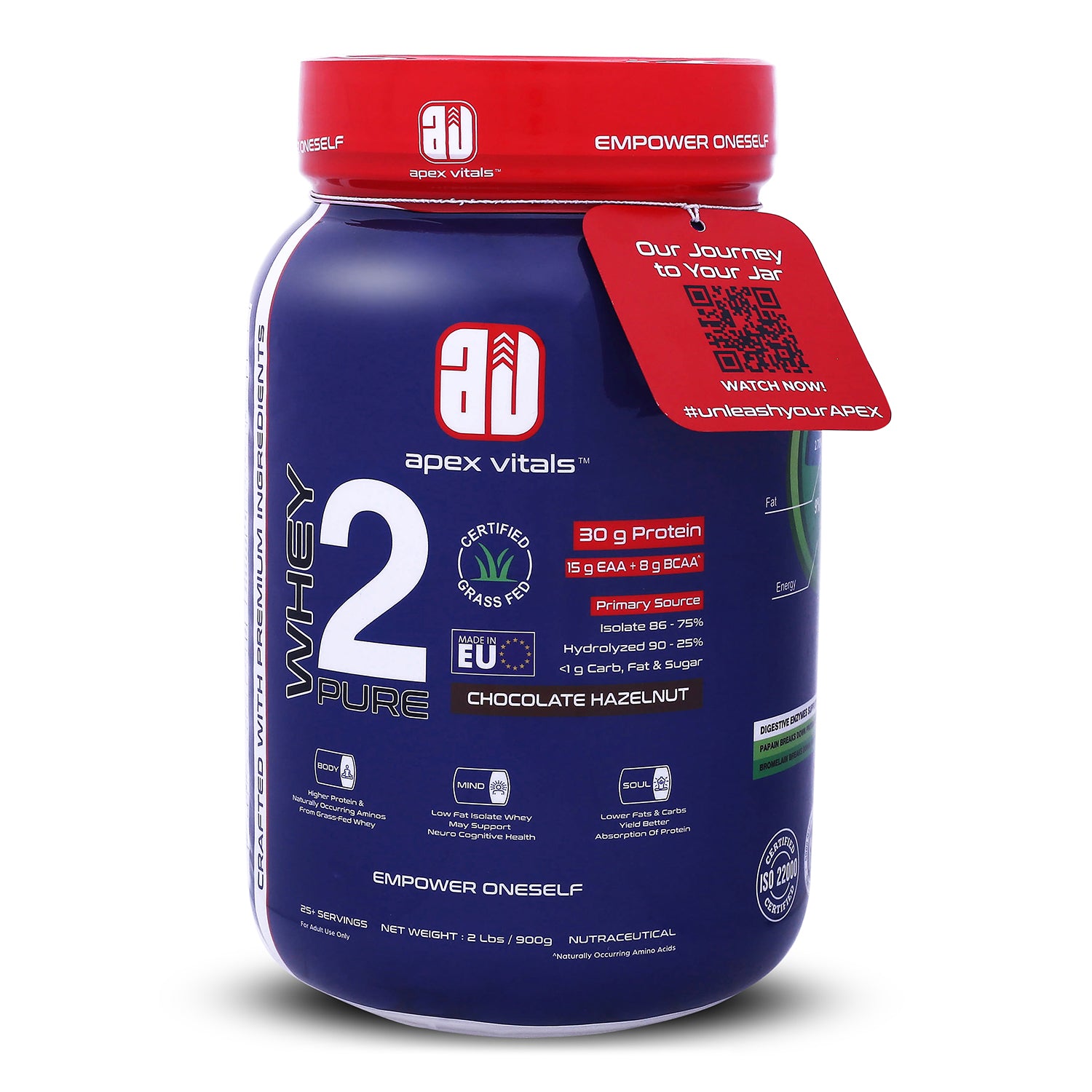 Apex Vitals Whey 2 Pure . Grass-fed Whey made in EU . Whey Isolate & Hydrolyzed . 30g protein, 15g EAA+8g BCAA . Digestive Enzymes . Muscle Build & Recovery . 900gm (2lbs) - 25+ Ser